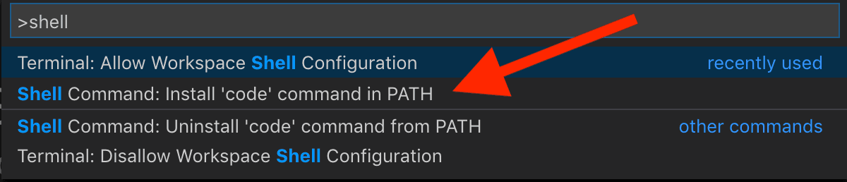 Code, and use cmd + shift + p to open Search. Type in shell, and install